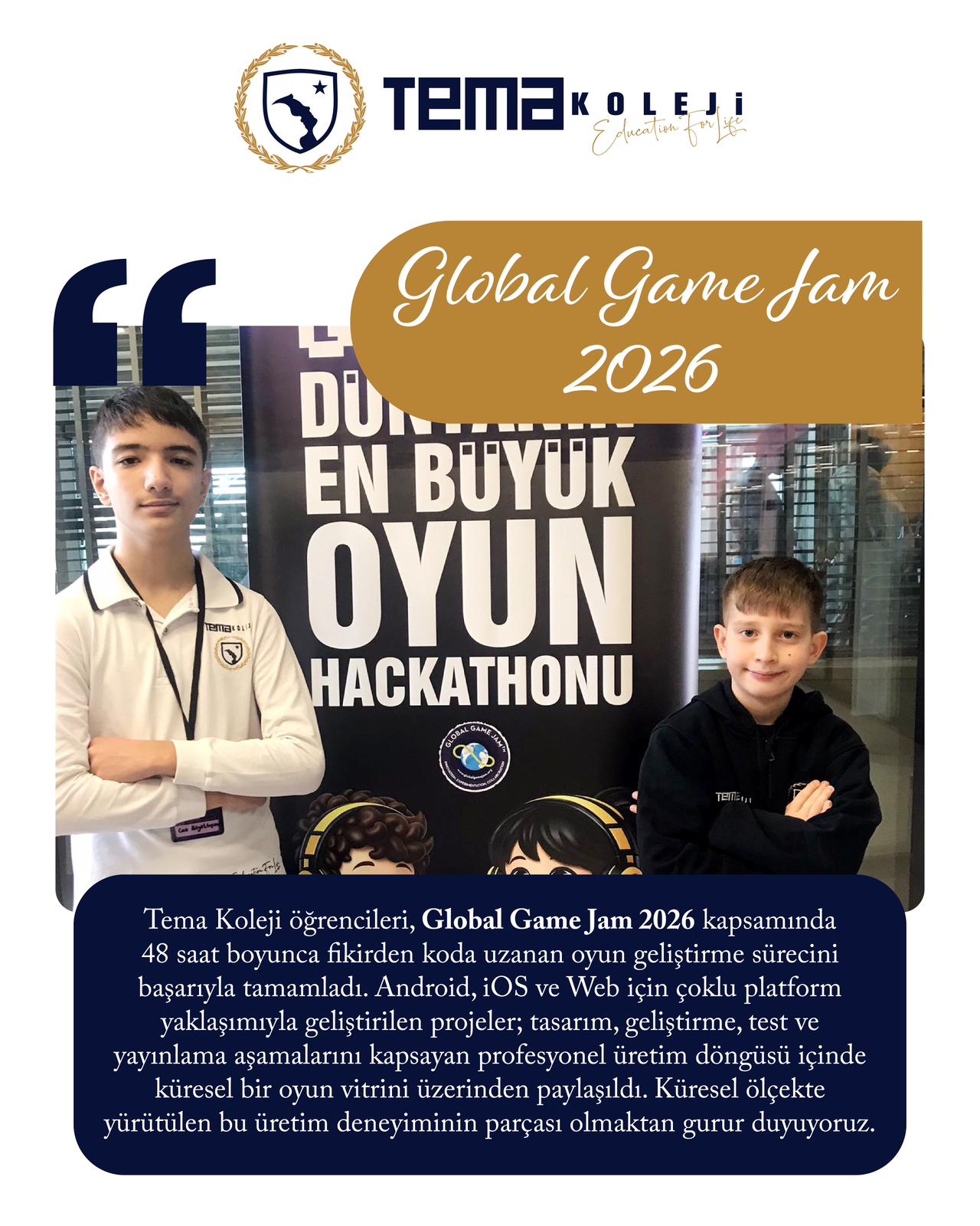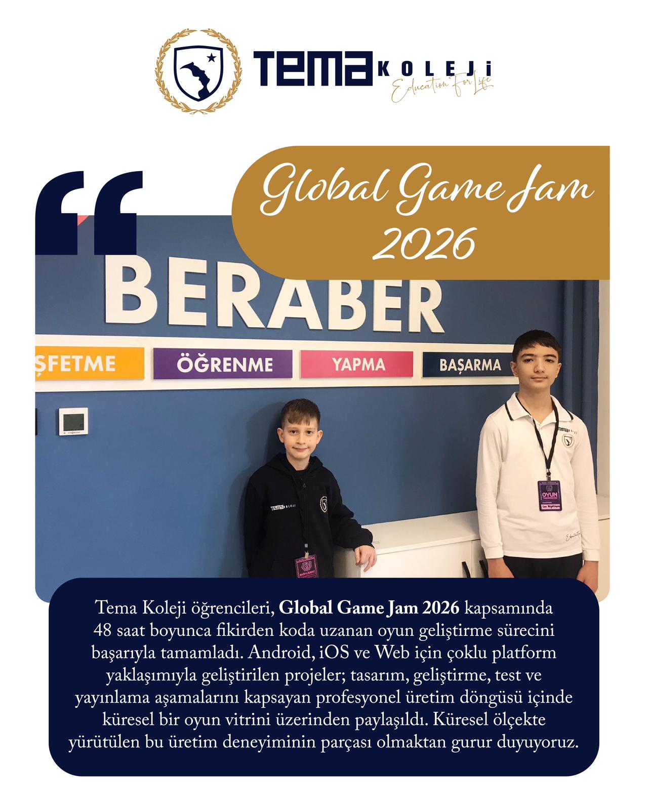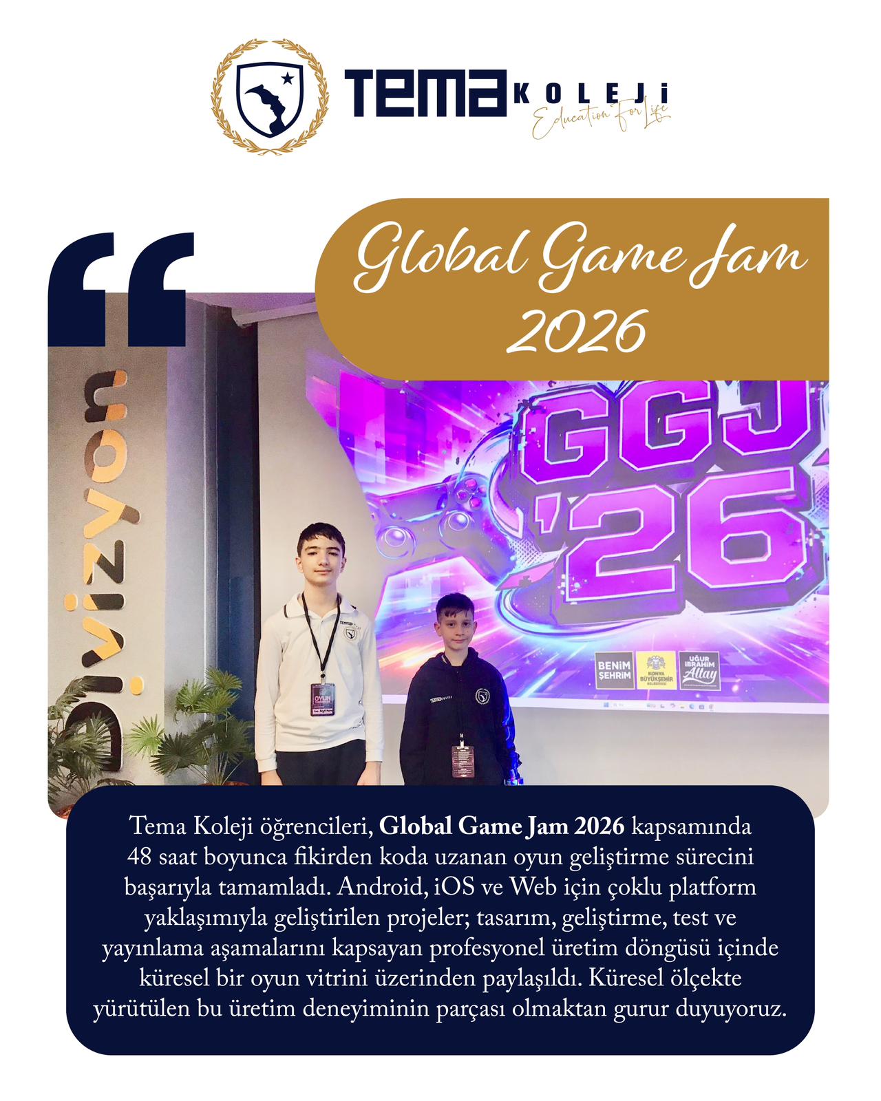 Tema Koleji öğrencileri, Global Game Jam 2026 kapsamında 48 saat boyunca fikirden koda uzanan oyun geliştirme sürecini başarıyla tamamladı.